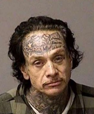 Tattoos of stars and "Mexicano" on head, "David", "Davina", "Aliz" and other designs on forehead, stars on both eyelids, "XIV", "Menchaca" and other designs on neck, multiple unknown tattoos on chest, Medusa on right arm, "Fear No Man" on right hand
