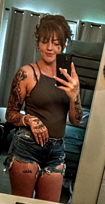 Multiple unknown tattoos on face and on eyebrow, paw prints tattooed on chest, Alaya and other unknown tattoos on right arm, multiple unknown tattoos on left arm, unknown writing tattooed on unknown thigh