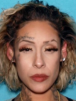 Tattoo over left eyebrow, "Stand tall refuse to fall" tattoo over collar bone, woman's face tattoo on right shoulder blade, "Evalina" with flowers tattoo over right bicep, and scars under left eye and on forehead
